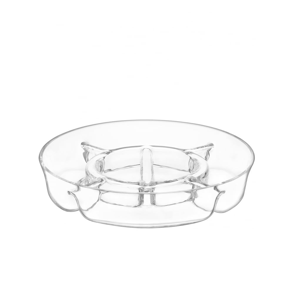 A handmade circular dish with four compartments. This versatile dish is ideal for serving nuts, olives, dips or a selction of chocolates after dinner. Handmade by skilled glass artisans, it complements the extensive range of platters and dishes in the Serve collection, designed for all occasions.