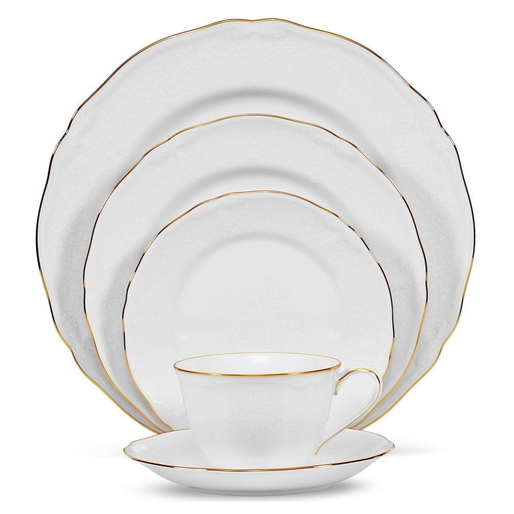 Princess Bouquet Gold (1660) features the most delicate white on white application of ethereal flowers and lace, paired with a white porcelain body with distinctive scalloped edges and a thin metallic band. Dishwasher safe.