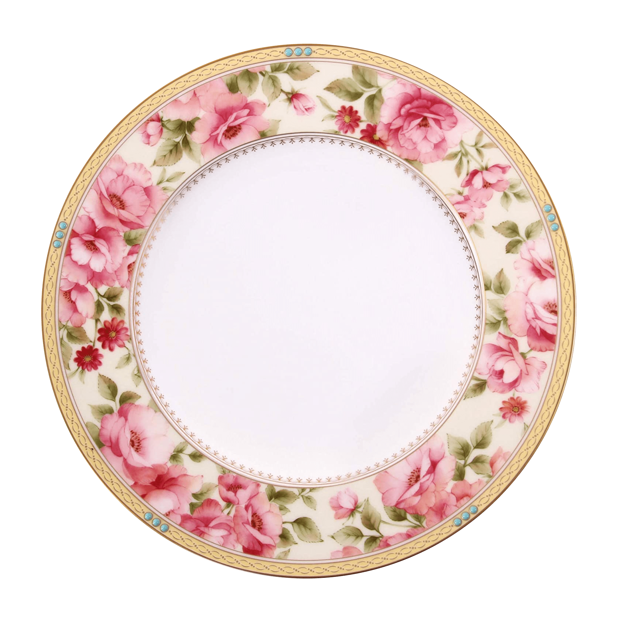 Hertford (4861) features a classic floral color palette and design, with touches that make it perfectly modern. Pink and red roses cover the rim of the plate, and the design is surrounded by a stunning infinity etching on the stroking gold band. Delicate raised turquoise enamel dots applied to the band create the perfect finishing touch.