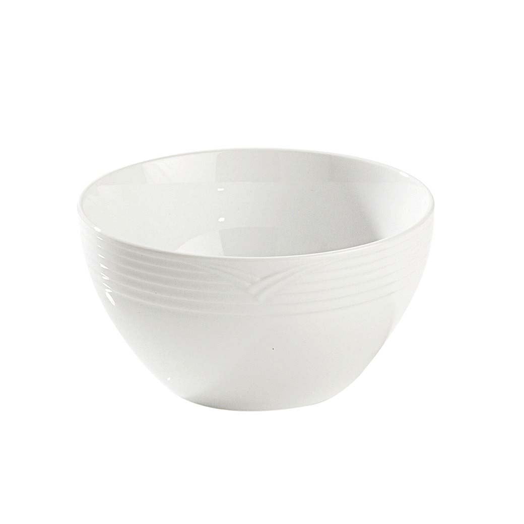 Arctic White (4000), contemporary design in white with a subtle circular embossed rim on a white fine porcelain body. Microwave & Dishwasher Safe.
