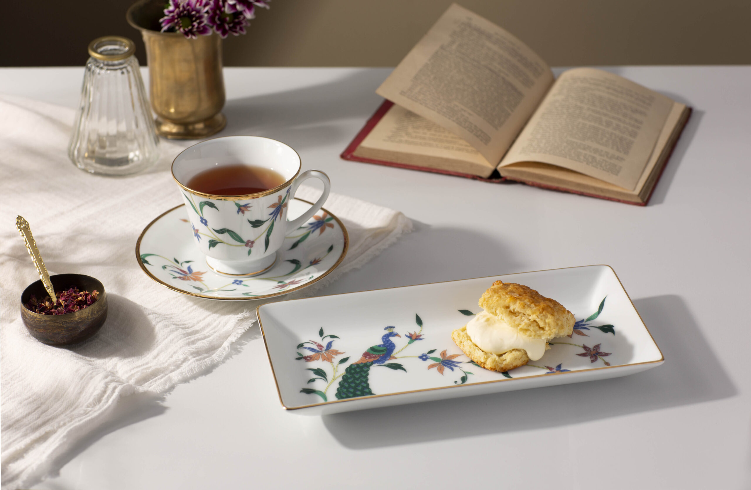 The flower motifs are inspired by Pietra Dura, a traditional Indian decorative technique, where colored polished stones are arranged like Indian Calico to create vivid images. The accent salad plate features a colorful peacock, the national bird of India and the source of good fortune according to religious traditions.