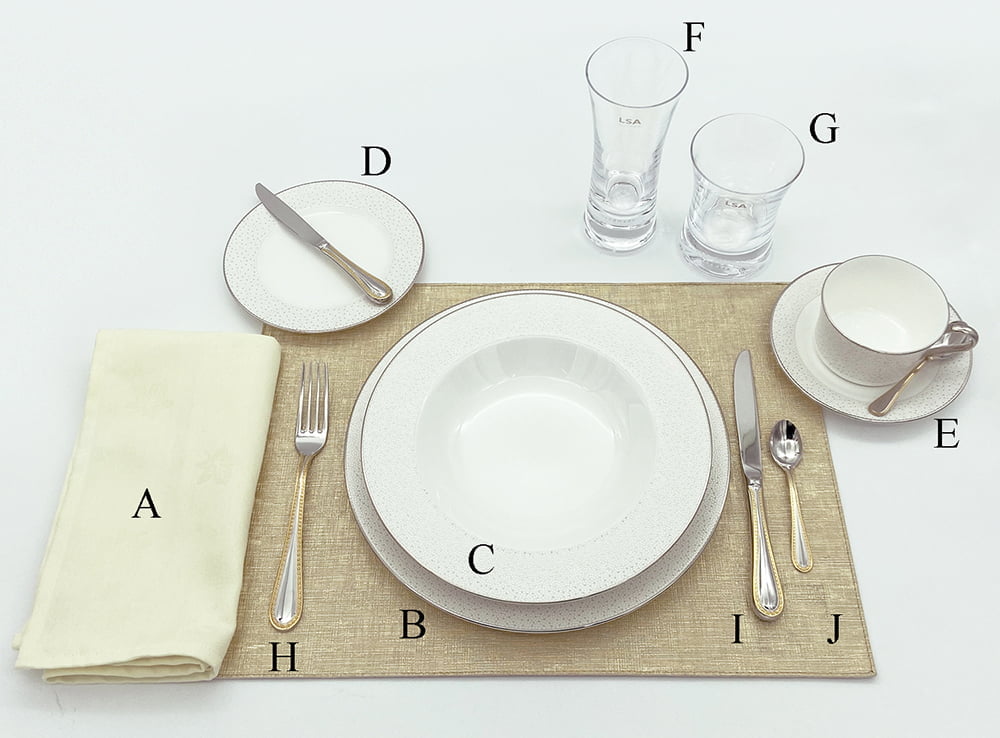 Start with a dinner plate, soup or cereal bowl (always optional), bread & butter plate (for toast, bagels, etc.), and a cup & saucer for coffee or tea. For the flatware, use a 3-piece place setting: dinner fork, dinner knife and teaspoon. The napkin should be placed on the left side of the fork. Complete each place setting with either a juice or beverage glass.
