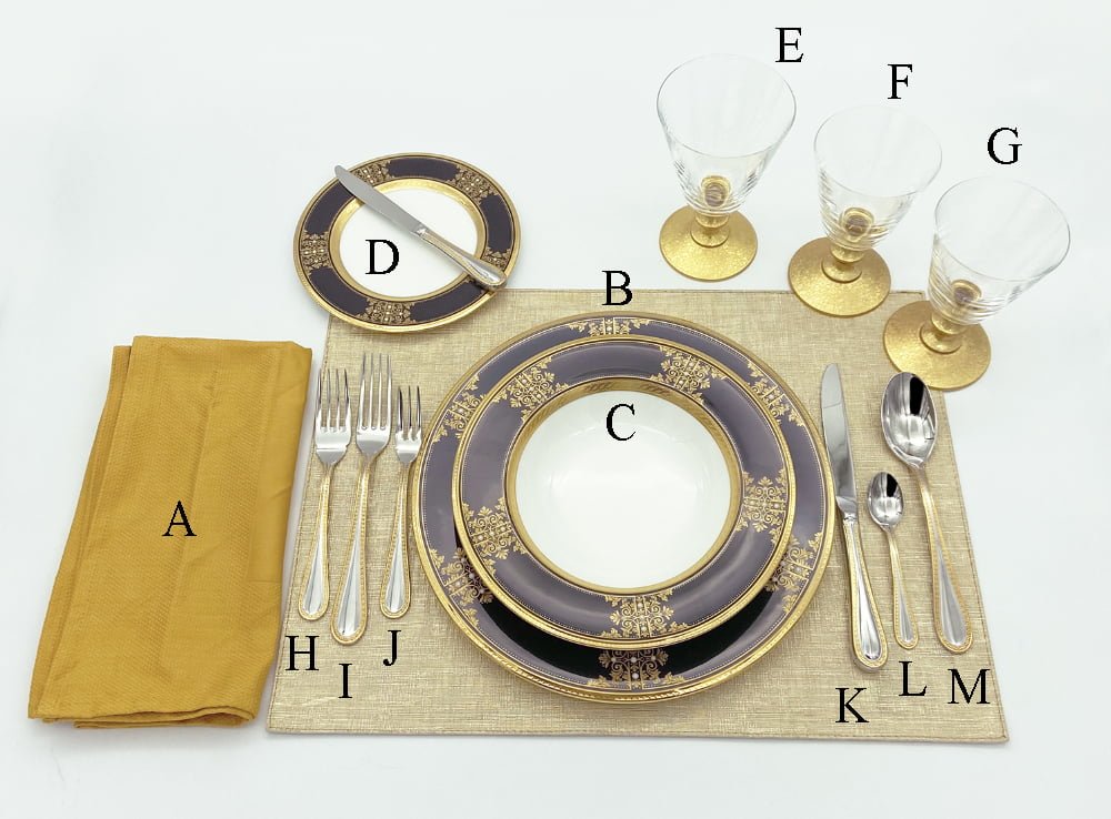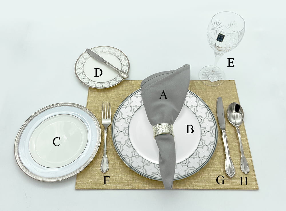 Set the table with a bread & butter plate, a service base plate and dinner plate. If your pattern doesn’t include a service plate, try being a little creative and use a metal tray or glass underliner. For flatware, use dinner fork, salad fork (served after the entree), dinner knife and soup spoon. The butter spreader may be placed on the butter plate.